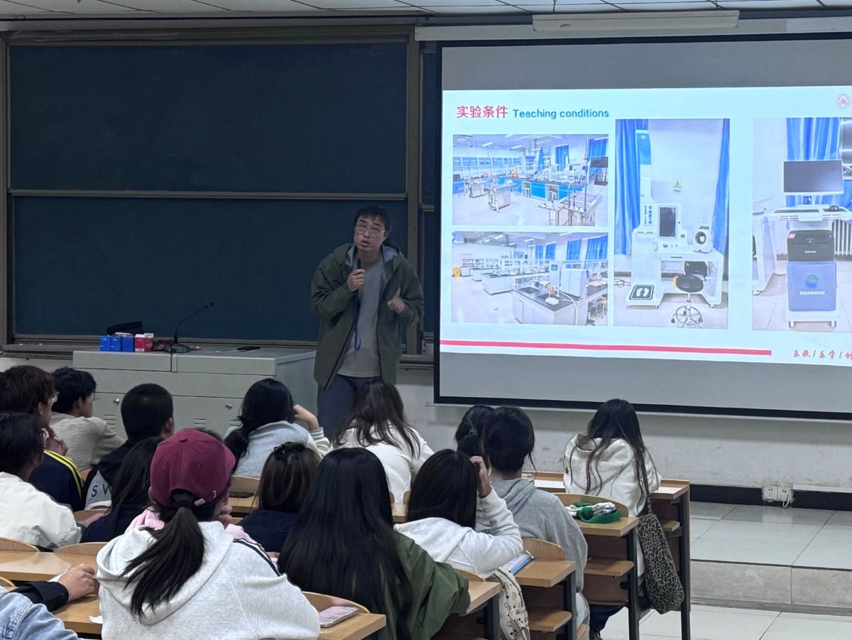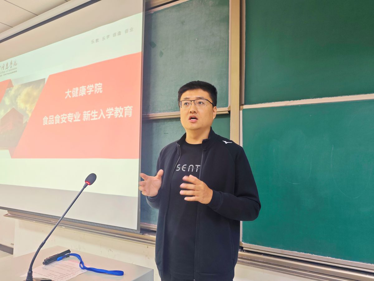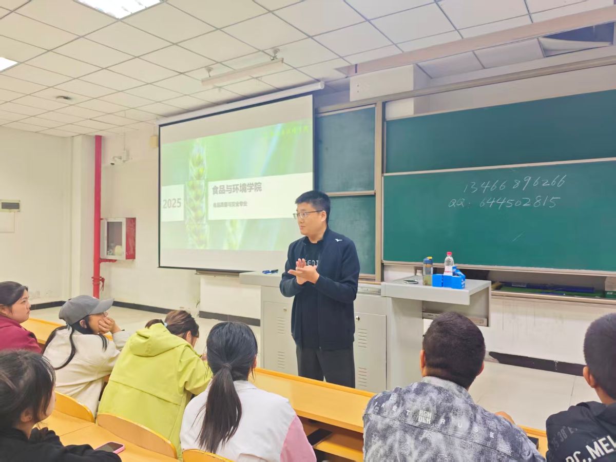 食品质量与安全、食品营养与健康两个专业的新生共同参与了由戴铭成老师主讲的入学教育。戴铭成老师以“从农田到餐桌:食品专业的责任与机遇”为题,先分别解析了两个专业的课程差异与关联:“食品质量与安全专业更侧重‘安全把控’,《食品微生物学》《食品毒理学》《食品安全检测技术》等课程,培养大家识别食品风险、开展质量检测的能力;食品营养与健康专业则聚焦‘营养优化’,《营养学》《食品营养配餐》《特殊人群营养》等课程,帮助大家掌握不同人群的营养需求,设计科学的膳食方案。但两个专业并非独立,都需要以《食品化学》《食品工艺学》为基础,共同守护‘舌尖上的安全与健康’。”